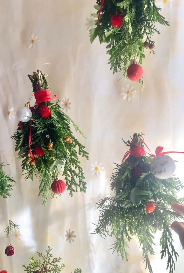 長さ15〜20cmほどの小さめのスワッグです。 グリーンメインでシンプルに、そこへ 赤色の飾りをつけて可愛らしく仕上げました。